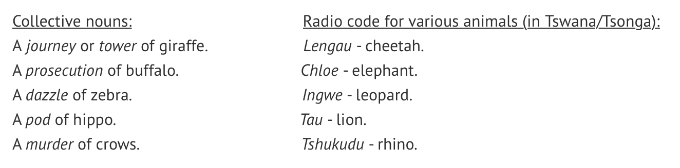 Though I have been going to the game reserve all my life, there is always something new to learn, or something I’ve forgotten. The sunsets, the calls, the smells, the baked earth, all come rushing back to me. This time, not only did I learn about the wild, but about myself. As we kept our ‘eyes peeled’ and ‘spotted’, I realised that I still use the childish names for animals, that I’ve used since I first learned to speak: ‘zebbies’, ‘guinneas’, ‘ellies’, ‘gerries’, ‘hippies’, ‘crocs’, ‘vildies’, ‘warties’. When we were children, my father used to make us keep a journal of the birds and animals we had spotted each day in the reserve.
