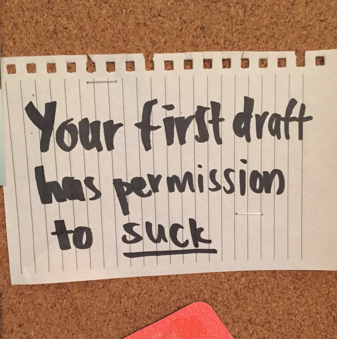 first draft“Your first draft has permission to suck,” she told me “I have that reminder written on a piece of paper stuck to the wall above my desk.”