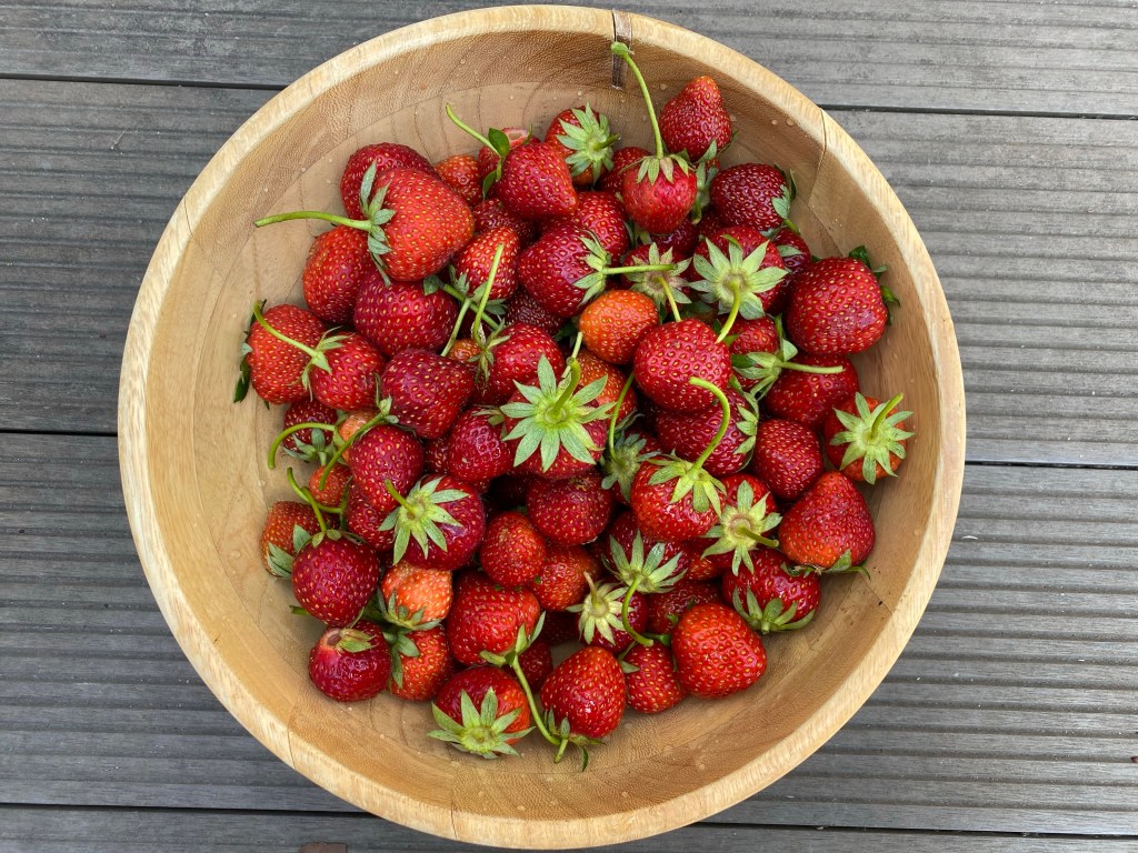 It was a long cold spring so everything is a little late this year. But, some things are now poking their heads out of the ground and giving it a go – runner beans, potatoes, 1 tomato plant from my sis-in-law in Hull, onions, garlic, chillies, cauliflower, curly kale, marrows, asparagus, rhubarb, raspberries and heaps of strawberries.