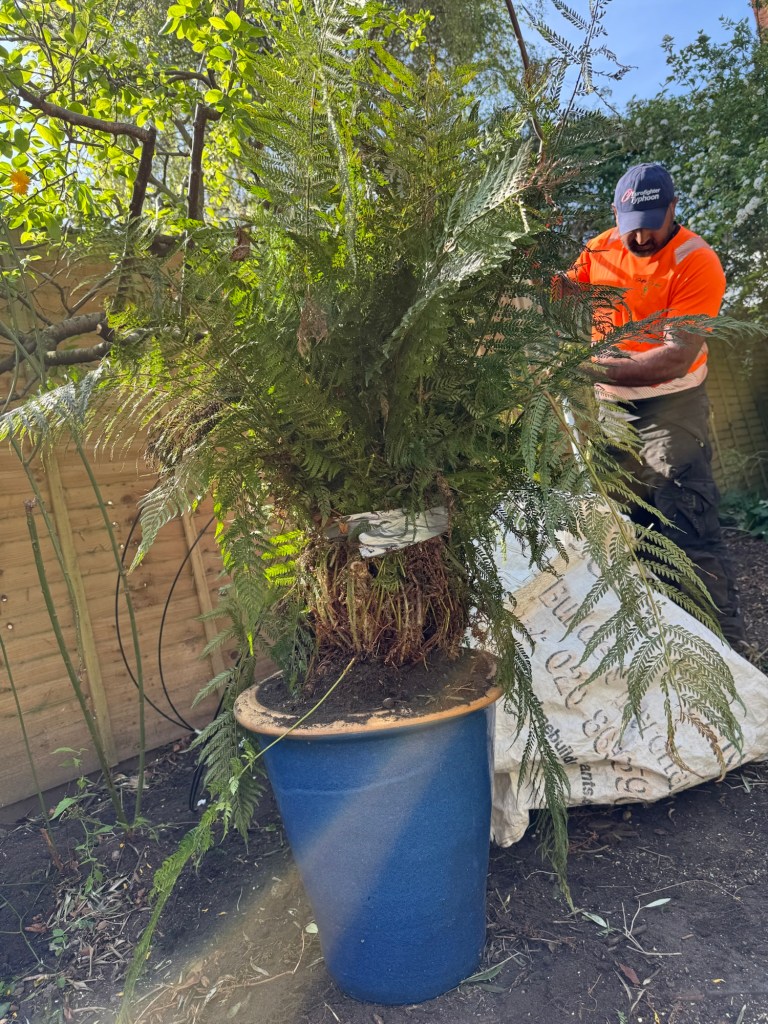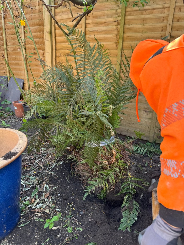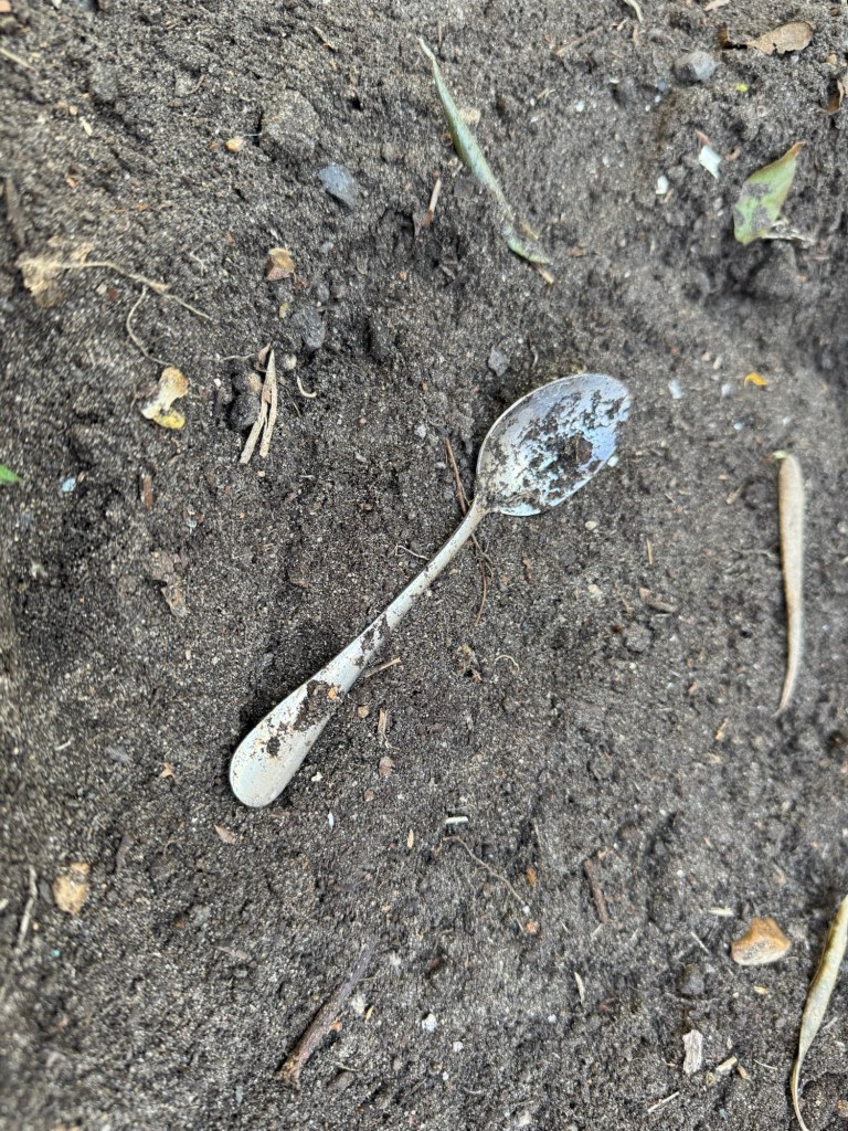 In the garden, we discovered a lovely fern (Mama thinks it’s a ‘leather fern’), which we potted and tended – very excited! We also excavated an old spoon (keeping with the tea theme), a shopping trolley (or 3), an antique cast iron French fountain ‘thingy’, a lot of glass, slate and rocks, and a covered pond/water feature hiding under the fake grass.